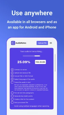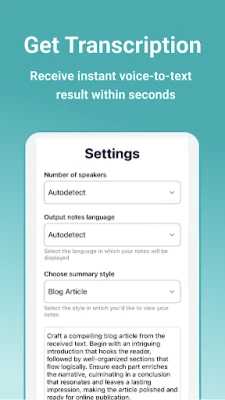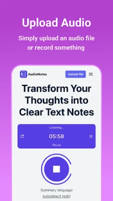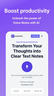 Iedomājieties, ka jūsu domas un idejas acumirklī pārvēršas sakārtotā, lietojamā tekstā. AudioNotes.ai ir inteliģents risinājums, kas maina veidu, kā jūs tverat informāciju. Neatkarīgi no tā, vai vēlaties ierakstīt savu balsi tieši lietotnē vai augšupielādēt jau esošu audio failu, AudioNotes.ai ar progresīvu tehnoloģiju palīdzību nodrošina precīzu atšifrēšanu un kvalitatīvu kopsavilkumu ģenerēšanu. Jums ir pilnīga kontrole – pielāgojiet teksta garumu un izvēlieties vēlamo valodu, lai saturs atbilstu jūsu vajadzībām.