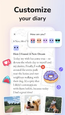 Pārvērtiet savu dienasgrāmatu par dinamisku atmiņu albumu, kas nav tikai vārdi. Ar "Daily Diary: Journal with Lock" jums ir iespēja bagātināt savus ierakstus ar fotogrāfijām, pārvēršot katru lapu par spilgtu vizuālu stāstu. Fiksējiet savas emocijas un noskaņojumu, izmantojot integrēto garastāvokļa izsekotāju. Tas ļaus jums labāk izprast sevi, atklājot, kas jūs patiesi iedvesmo vai nomāc, tādējādi veicinot personīgo izaugsmi. Šī lietotne ir ideāli piemērota arī kā pateicības dienasgrāmata, palīdzot koncentrēties uz pozitīvo un apzināties ikdienas mazās laimes.