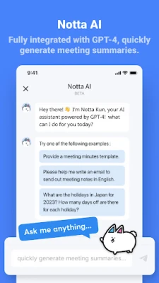 Iedomājieties pasauli, kurā katrs izteiktais vārds, katra svarīgā detaļa no sanāksmes vai intervijas tiek automātiski pārvērsta precīzā tekstā, ļaujot jums pilnībā iesaistīties notiekošajā. Notta ir jūsu inteliģentais palīgs, kas radīts, lai atvieglotu informācijas tveršanu ar nepārspējamu precizitāti un ātrumu. Ar Notta vairs nav jāsatraucas par pierakstu veidošanu — tas acumirklī pārveido sarunas tekstuālā formātā, nodrošinot, ka nekas netiek palaists garām. Fokusējieties uz domu apmaiņu, un ļaujiet Notta rūpēties par visu pārējo, pat izveidojot kopsavilkumus ar mākslīgā intelekta palīdzību.