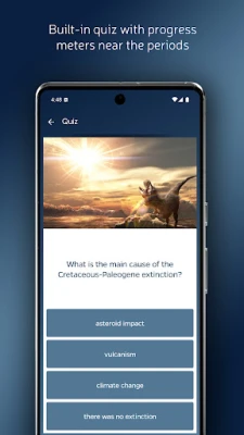 Pārbaudiet un nostipriniet savas jauniegūtās zināšanas, izmantojot aptverošu viktorīnu ar 1507 jautājumiem, kas palīdzēs padziļināt izpratni. Sekojiet līdzi savam progresam ar intuitīviem mācību progresa rādītājiem (no 0 līdz 100%) katram ģeoloģiskajam periodam un eonam, nodrošinot caurskatāmu ceļu uz zināšanām. Neatkarīgi no tā, kur atrodaties, zināšanu pasaule ir pieejama bez interneta savienojuma. Turklāt šis izglītojošais rīks piedāvā daudzvalodu atbalstu angļu, spāņu, vācu, franču, itāļu, Brazīlijas portugāļu, krievu, lietuviešu un slovēņu valodās, nodrošinot plašu pieejamību. Izmantojiet to brīvi mācību nolūkos, lai paplašinātu izpratni par Zemes vēsturi.