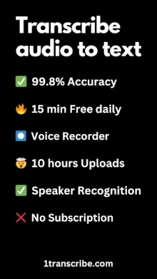 Atklājiet 1 Transcribe – jūsu inteliģento asistentu, kas pārvērš runāto vārdu precīzā, rakstītā tekstā. Aizmirstiet par manuālu pierakstu veikšanu un ļaujiet mūsu progresīvajam AI dzinējam pārveidot sanāksmes, balss piezīmes, intervijas un pat video saturu skaidrās transkripcijās. 1 Transcribe ir radīts, lai atvieglotu jūsu ikdienu, nodrošinot nevainojamu un ātru pieredzi, kas ļaus jums koncentrēties uz patiesi svarīgo. Tas ir viss vienā risinājums jūsu produktivitātes uzlabošanai.