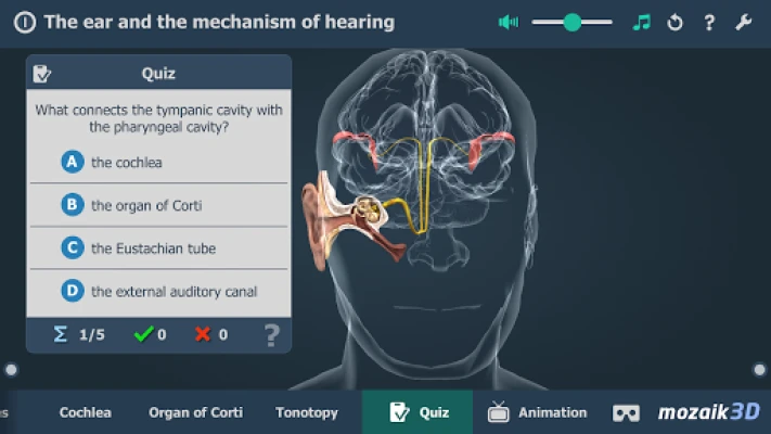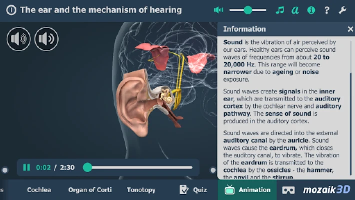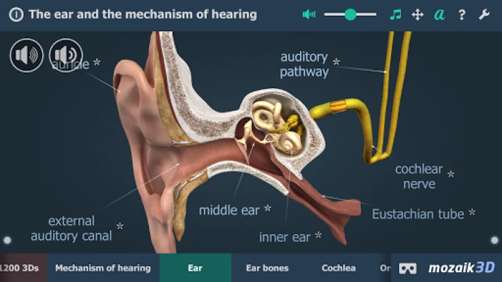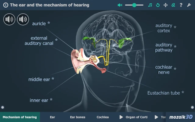 "The mechanism of hearing 3D" iepazīstina ar auss uzbūvi un dzirdes mehānismu. Izpētiet, kā ausis pārvērš gaisa vibrācijas elektriskos signālos, ko apstrādā smadzenes. Šīs interaktīvās 3D ainas, paredzētas skolēniem, ir saistošas ikvienam. Grieziet, palieliniet un izbaudiet animācijas ar balss stāstījumiem.