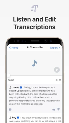 Pārveidojiet skaņu par tekstu bez piepūles ar The Transcribe app — izcilu risinājumu, kas radīts, lai atvieglotu Jūsu ikdienu. Šī viedā lietotne, ko darbina progresīva mākslīgā intelekta tehnoloģija, ātri un precīzi pārvērš runu un video par rakstītu tekstu. Neatkarīgi no tā, vai Jums nepieciešams fiksēt svarīgus sapulču protokolus, diktēt intervijas, saglabāt lekciju saturu vai vienkārši pārvērst balss piezīmes par lasāmu tekstu, The Transcribe app nodrošina nevainojamu pieredzi. Atvadieties no manuālas pierakstīšanas un atveriet jaunus produktivitātes apvāršņus.