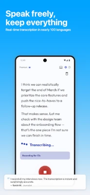 Dictate ir jūsu neaizstājams palīgs jebkurā situācijā – sākot no svarīgām biznesa sanāksmēm un podkāstu piezīmēm, līdz pat grāmatu lasījumu fiksēšanai vai medicīnisku norādījumu ierakstīšanai. Tā garantē ātras un uzticamas transkripcijas, bieži vien pat tiešraides režīmā, ļaujot jums redzēt tekstu parādāmies ekrānā, kamēr runājat. Produktivitāte ir prioritāte, tāpēc Dictate piedāvā tūlītēju piekļuvi, izmantojot ērtu sākuma ekrāna logrīku vai vienmēr pieejamu paziņojumu, kas ļauj veikt balss diktēšanu tieši no bloķēšanas ekrāna. Pabeigtās transkripcijas tiks automātiski nosūtītas uz jūsu norādīto e-pasta adresi dažu sekunžu laikā. Ar atbalstu gandrīz simts valodām, Dictate nodrošina, ka varat diktēt sev vēlamajā valodā bez jebkādām grūtībām.